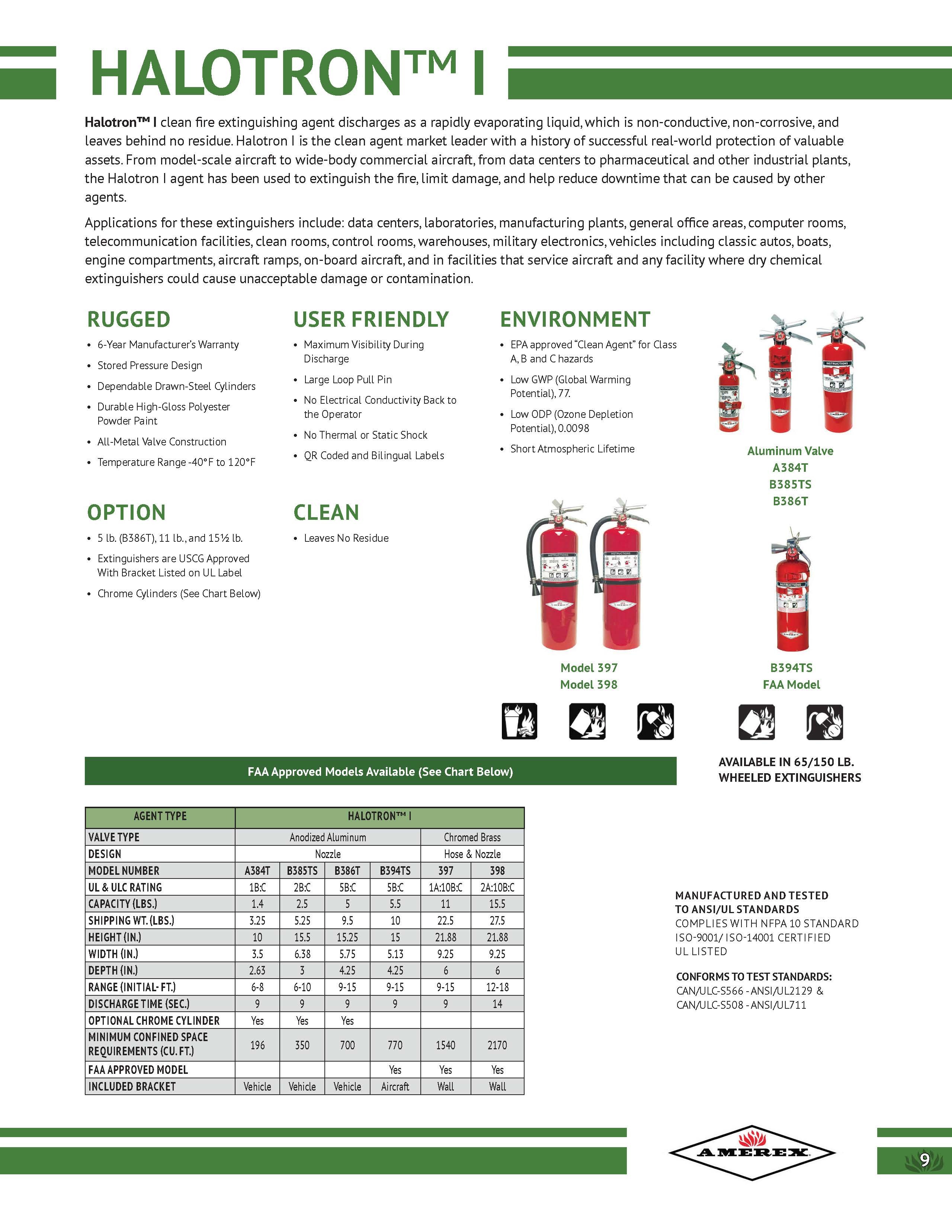 Amerex 397, Amerex 398: Halotron Extinguishers weighing 11lb and 15.5lb have an ABC rating, and can be used on class A, B, and C fires.